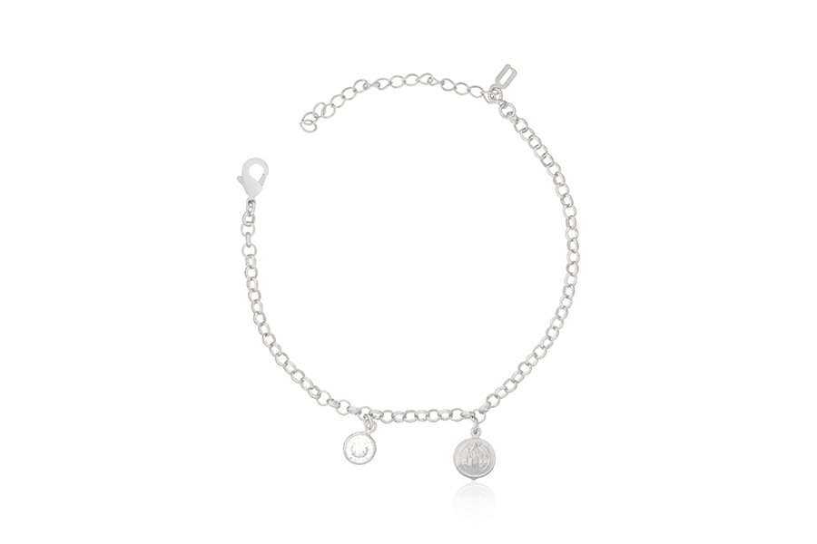 PULSEIRA BANHADA EM RÓDIO BRANCO, ELO PORTUGUÊS 3mm, 16cm COMPRIMENTO, EXTENSOR 5cm, PONTO DE LUZ 7mm E SÃO BENTO 9mm DIÂMETRO
