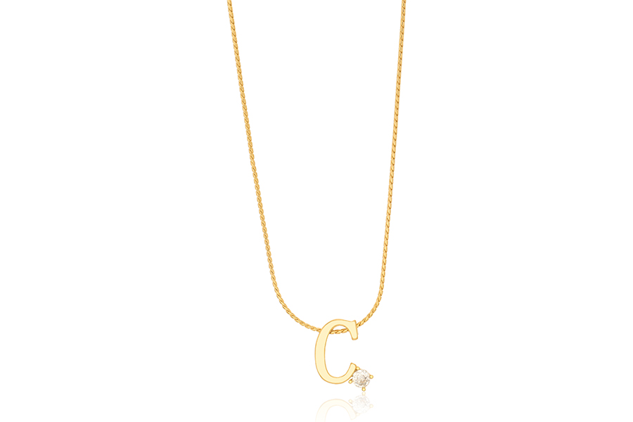 GARGANTILHA BANHADA EM OURO, ELO 0,70mm, 40cm COMPRIMENTO, EXTENSOR 10cm COMPRIMENTO, LETRA C, 11mm ALTURA E PONTO DE LUZ 3mm