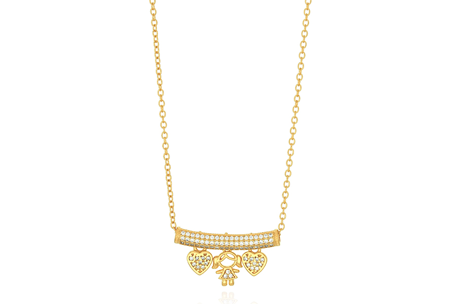 GARGANTILHA BANHADA EM OURO, ELO OVAL 1,50mm LARGURA, 40cm COMPRIMENTO, EXTENSOR 10cm COMPRIMENTO, CANGA 26mm COMPRIMENTO, MENINA E 2 CORAÇÕES