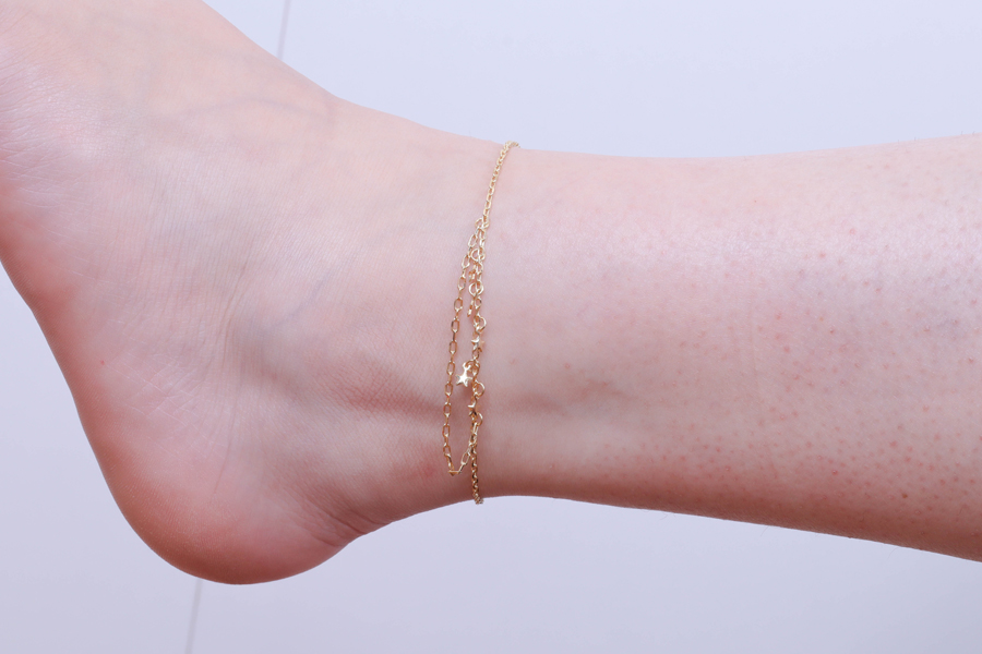 TORNOZELEIRA BANHADA EM OURO, ELO CARTIER 1,80mm LARGURA, 24cm COMPRIMENTO, EXTENSOR 4cm, 5 ESTRELAS