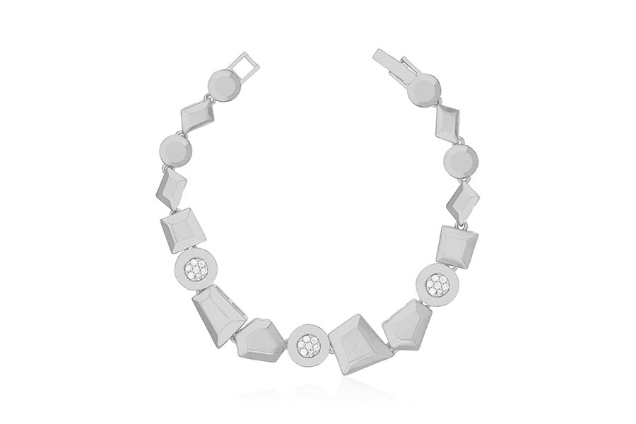 PULSEIRA BANHADA EM RÓDIO BRANCO, ELOS COM VÁRIOS FORMATOS, 18cm COMPRIMENTO, LINHA OUSE